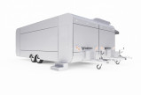 На корпусе установлены два блока по две фары спереди и два блока по два фонаря сзади. Установленная светотехника соответствует европейским стандартам. Внутренняя облицовка стен и потолка - нержавеющая сталь AISI 430 толщиной не менее 0,5 мм. Пирог пола - рифленый алюминий (квинтет) 1,5 мм, подложка 4 мм, ламинированная фанера 12 мм, утепление пола - 50 мм, ламинированная фанера 12 мм. Утепление стен негорючим утеплителем - 40 мм. Дышло прицепа имеет V-образную форму. Резино-жгутовая ось нагрузкой до 1 800 кг под диск 5x112 для легкового прицепа – 2 шт. Общая грузоподъёмность 3 600 кг. Колесный тормоз - тип 2361 AL-KO. Кованые рычаги AL-KO. Профиль трубы шестигранный. Колесо в сборе 195R14C8 5,5J х 14 H2 (112x5) 900 кг. Допустимая масса прицепа: 3600 кг. Механизм тормоза наката с фланцевым соединением тип Profi. Исполнение: под V-образное дышло. Комплектация: со сцепным устройством AK351. Нагрузка на шар фаркопа (ТСУ): 150 кг. Автоматическое опорное колесо с приваренным кронштейном крепления к дышлу прицепа и складной ручкой. Материал диска – сталь. Материал колеса – резина. Встроенный упорный подшипник – да. Статическая нагрузка - 800 кг. Винтовая опора для прицепа, прицепа-дачи, торгового прицепа – 4 шт, нагрузка на каждую опору - 800 кг. Возможность подключения к внешним сетям электроснабжения 220/380 V или внешнему генератору через специальный щиток с блоком разъёмов. Электрощит навесной 54 IP 40 прозрачная черная дверца BNK 40-54-1 модуля со счетчиком (ЦЭ-6803В 1 3Ф 5-60А 230В 1-й класс точности 1 тариф) и автоматами защиты (фирмы ABB), устройством дифференциального тока (УЗО) (фирмы ABB) раздельно на каждую из групп потребителей. Мощность до 45 кВт.
