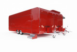 На корпусе установлены два блока по две фары спереди и два блока по два фонаря сзади. Установленная светотехника соответствует европейским стандартам. Внутренняя облицовка стен и потолка - нержавеющая сталь AISI 430 толщиной не менее 0,5 мм. Пирог пола - рифленый алюминий (квинтет) 1,5 мм, подложка 4 мм, ламинированная фанера 12 мм, утепление пола - 50 мм, ламинированная фанера 12 мм. Утепление стен негорючим утеплителем - 40 мм. Дышло прицепа имеет V-образную форму. Резино-жгутовая ось нагрузкой до 1 800 кг под диск 5x112 для легкового прицепа – 2 шт. Общая грузоподъёмность 3 600 кг. Колесный тормоз - тип 2361 AL-KO. Кованые рычаги AL-KO. Профиль трубы шестигранный. Колесо в сборе 195R14C8 5,5J х 14 H2 (112x5) 900 кг. Допустимая масса прицепа: 3600 кг. Механизм тормоза наката с фланцевым соединением тип Profi. Исполнение: под V-образное дышло. Комплектация: со сцепным устройством AK351. Нагрузка на шар фаркопа (ТСУ): 150 кг. Автоматическое опорное колесо с приваренным кронштейном крепления к дышлу прицепа и складной ручкой. Материал диска – сталь. Материал колеса – резина. Встроенный упорный подшипник – да. Статическая нагрузка - 800 кг. Винтовая опора для прицепа, прицепа-дачи, торгового прицепа – 4 шт, нагрузка на каждую опору - 800 кг. Возможность подключения к внешним сетям электроснабжения 220/380 V или внешнему генератору через специальный щиток с блоком разъёмов. Электрощит навесной 54 IP 40 прозрачная черная дверца BNK 40-54-1 модуля со счетчиком (ЦЭ-6803В 1 3Ф 5-60А 230В 1-й класс точности 1 тариф) и автоматами защиты (фирмы ABB), устройством дифференциального тока (УЗО) (фирмы ABB) раздельно на каждую из групп потребителей. Мощность до 45 кВт.